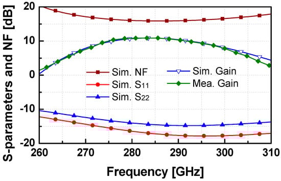 The proposed 280 GHz amplifier was designed in 130 nm SiGe technology with an fT/fmax of 350/450 GHz. Figure 12 shows a photo of the fabricated amplifier, which occupies an area of 0.71 × 0.3 mm2, including all the pads. The amplifier consumes a DC current of 62 mA from a 1.6 V supplier. A continuous wave (CW) measurement was used to measure the gain of the amplifier. The input signal was generated from a frequency multiplier SGX VDI 2.8 combined with a signal generator Agilent 83623B. An integrated thru was used to calibrate the loss of GGB probes and waveguides. The output power of the amplifier was characterized by an Erickson calorimeter (VDI PM-5). Figure 13 shows the simulation results of the noise figure and s-parameters of the amplifier in comparison with the measured gain. As can be seen, the measured gain fits well with the simulation results. The maximum measured gain was 10.9 dB recorded at 283 GHz. The 3 dB gain’s bandwidth was 30 GHz from 270 to 300 GHz. In the simulation, S11 and S22 are smaller than −10 dB in the operation range. Meanwhile, the simulated NF was minimized by 15.9 dB at ~286 GHz. The simulated output power of the amplifier at 283 GHz versus the input power is shown in Figure 14. The amplifier achieved an input 1 dB gain compression point (IP1dB) of −13.5 dBm, which corresponded to an output of 1 dB gain compression point (OP1dB) of around −3.6 dBm.