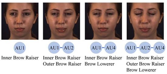 Facial action unit (AU) recognition involves the prediction for occurrence or non-occurrence of each AU, which is an important task in the communities of computer vision and affective computing [1,2,3,4]. As defined in the facial action coding system (FACS) [5,6], each AU is a local facial action with one or more atomic muscle actions. Due to the subtlety and non-rigidity, the appearance of AUs are diversely changed across persons and expressions. For instance, as shown in Figure 1, AU 1 (inner brow raiser), AU 2 (outer brow raiser), and AU 4 (brow lowerer) occur in brow regions with overlaps, in which it is difficult to distinguish each AU from the fused appearance. In the literature, facial AU recognition is still a challenging task.