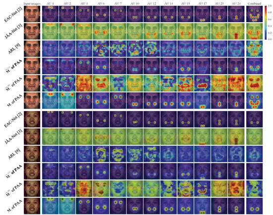 In Figure 4, we visualize the attention maps learned by recent attention learning-based methods, EAC-Net [2], JÂA-Net [3] and ARL [9], as well as , , and for each AU learned by our PAA. Owing to the subtlety and non-rigidity of AUs, different AUs have different appearances, including shapes and sizes, and AU appearances are also varied across persons and expressions. In this case, AUs should have diverse regional attention distributions. For example, the two images in Figure 4 are both in happy expression, while AU 14 co-occurs with AUs 6, 7, 10, 12, and 17 in the first image, and only occurs alone in the second image. It is expected that the same AU of the two images should have different attention maps.