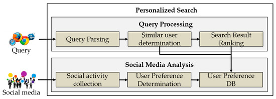 The proposed method consists of social media analysis and query processing, as shown in Figure 1. The user preference determination is a preprocessing operation in which social activities of social media users are continuously collected and analyzed. The collected social information is used to determine the user’s preferences according to his/her social activities. Keywords are detected using a morpheme analyzer according to the user’s social activities, and the user’s preferences are determined from the detected keywords using TF-IDF. When the user submits a query, similar users are identified according to the query. For identifying similar users, the proposed method considers users who have similar preferences to the user according to the determined preferences of the user, users who are actively engaged in professional activities in a specific field according to the query, and users who are linked as friends to the user. Thus, it uses network characteristics of social media to consider users with strong social relationships. The ranking algorithm reflects the user’s preferences in the web search results of the user query and then applies the preferences of similar users to present the search results. Furthermore, it uses the fractional cascading method to provide the search results in the descending order of the preferences matched between the user and similar users.