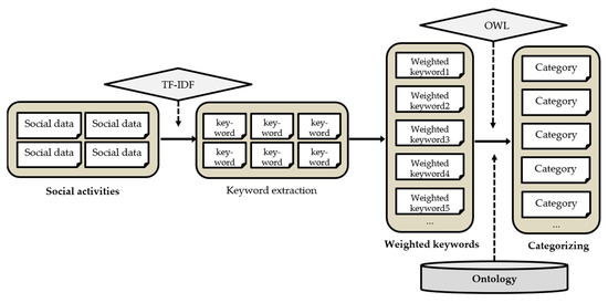 The user preference determination is based on the postings that the user has created or shared on social media. The user’s behavior of creating and sharing postings and writing comments can reflect his/her interests. Figure 2 shows the procedure of determining the user’s preferences. The user preference determination is performed as a preprocessing task, and the activities of social media users are continuously collected and analyzed. The collected information is used to determine the user’s preferences according to the user’s social activities, and a morpheme analyzer is used to detect keywords from the user’s social activity information. TF-IDF is a technique for determining the importance of words in documents in the field of information retrieval and text mining. Social media users express their opinions and thoughts in a variety of ways. Therefore, they include meaningless words in identifying user preferences. In other words, words generally used by users on social media or words that appear in all documents are not keywords that can grasp individual preferences. The proposed method applies TF-IDF to words extracted through a morpheme analyzer to extract keywords that reflect individual preferences well among words contained in the user’s social activity records. Keywords with high TF-IDF values are extracted as words that express the user’s specific tendency well, and otherwise, they are recognized as meaningless words and removed. In TF-IDF, the term frequency (TF) indicates the frequency of a certain keyword appearing in the document and the inverse document frequency (IDF) indicates how many documents have a particular keyword among all the documents. For example, suppose that the user has engaged with 1000 documents, among which three documents contain the keyword ‘Liverpool’. If the keyword ‘Liverpool’ appears three times in a document, the TF for this document is 3, and the IDF is 2.5215. Thus, the TF-IDF has a value of 7.5645. A higher TF-IDF score indicates that the keyword is more important. It is difficult to recognize the user’s preferences according to simple keywords of interest. Therefore, a process of categorizing major keywords of interest obtained from social media activities is required. An ontology is constructed using the categories for classifying pages existing on social media [70], and the user’s preferences are determined from the user’s major keywords of interest using the constructed ontology and Web Ontology Language (OWL) [71].