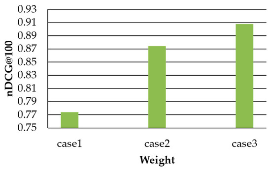 To evaluate the proposed method, we compared the scores of similar user determination by changing the weights , , and in Equation (6). We used the nDCG for k shown recommendations (nDCG@k) to evaluate the satisfaction with each search result. nDCG is a metric that was developed because of the difficulty of providing differentiation based on rankings with the traditional accuracy and recall-based search engine evaluation method. In this evaluation method, the degree of satisfaction increases as the documents that the user wants are placed higher on the results page. Regarding the satisfaction score for each document in the search results, Equation (7) was used to calculate the satisfaction with the search result by assigning weights in the order of presenting the documents from top to bottom. In Equation (8), IDCG refers to the ideal score for the user’s satisfaction with the search results. The nDCG score was calculated as the ratio of the DCG to the IDCG. Figure 3 shows the satisfaction evaluation results. In the proposed method, the weights were = 0.33, = 0.33, and = 0.33 for case 1; = 0.4, = 0.4, and = 0.2 for case 2; and = 0.45, = 0.45, and = 0.1 for case 3. Users with similar preferences and users engaged in numerous professional activities had larger impacts on the search results than users with strong social relationships.