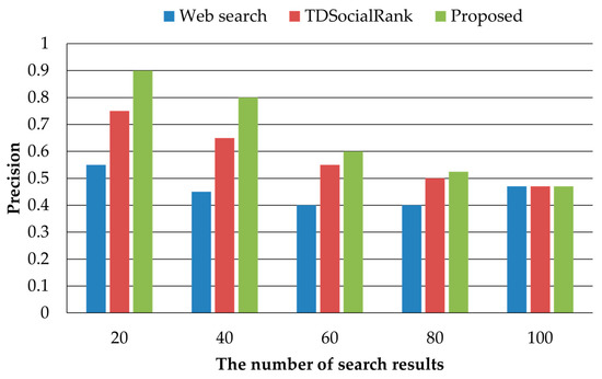 The precision, recall, F-measure, and G-measure are important performance metrics in information searches. To confirm the superiority of the proposed method, we evaluated it in comparison with a traditional web search method and TDSocialRank [56] with regard to the precision, recall, F-measure, and G-measure. Here, the proposed method was experimentally evaluated by applying the weights of case 3, which exhibited the best performance among the cases, as shown in Figure 3. The precision is defined as the ratio of the number of relevant documents to the number of documents searched in the information search field, and the recall is defined as the ratio of the number of documents found in the search to the number of relevant documents in the information search field. The precision represented the number of documents related to the query in the search results, as indicated by Equation (9), and the recall represented the ratio of the number of relevant documents to the total number of documents as indicated by Equation (10). Here, true positive () refers to the number of actually searching the documents that should be searched; false positive () refers to the number of searching the documents that should not be searched; and false negative () refers to the number of not searching among the documents that should have been searched. The F-measure is the harmonic mean of the precision and recall, as indicated by Equation (11), and the G-measure is the geometric mean of the precision and recall, as indicated by Equation (12).