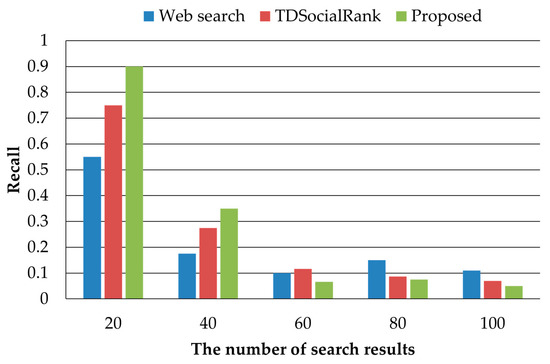Figure 5 shows the recall results for the proposed method and the existing methods. Similar to the case of precision, the regular web search method exhibited the worst recall performance. TDSocialRank exhibited better performance than the regular web search but was outperformed by the proposed method because it provided results that the user does not want. The proposed method provides only the search results that the user wants because it considers the user’s recent preferences and the characteristics of users with similar preferences. Because the proposed method provides results considering the preferences of similar users, the performance declined when the number of search results increased. Nevertheless, it exhibited a performance improvement of up to 27% compared with TDSocialRank.
