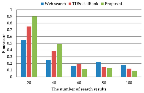 Figure 6 shows the results of comparing the F-measure among the proposed method and the existing methods. The F-measure is a performance metric for combining the tradeoff relationship between the precision and recall. Even when the number of search results provided changed, the proposed method outperformed the regular web search with regard to the F-measure. However, for the proposed method, the recall decreased as the number of search results increased; thus, it was outperformed by TDSocialRank in some cases. When the number of the search results decreased, it exhibited a performance improvement of up to 26%.