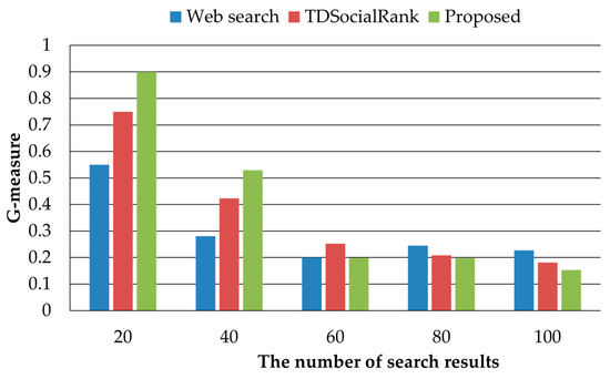 Figure 7 shows the results of comparing the G-measure between the proposed method and the existing methods. Even when the number of the search results changed, the proposed method outperformed the regular web search with regard to the G-measure. However, similar to the case of the F-measure, the proposed method had the problem that the recall decreased as the number of search results increased. Therefore, it was outperformed by TDSocialRank in some cases. When the number of the search results decreased, it outperformed TDSocialRank by up to 25%.