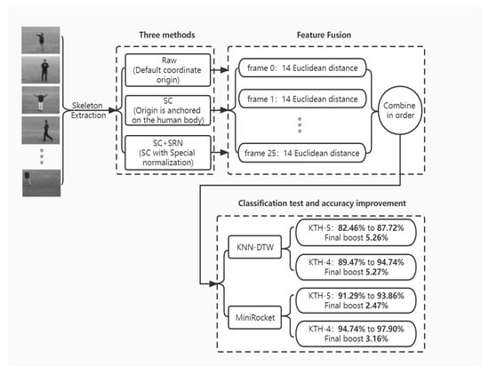 The main flow of this experiment is shown in Figure 1. First, we extracted 26 frames (fixed values) for each action video (frame rate of 25 fps) of the KTH dataset, enough frames to describe each action category, from 0–25 frames within 1 S from the beginning to the end. All extracted images were processed by existing opensource methods to obtain the corresponding human skeletal feature points in each image (23 feature points in total). Here, we used the opensource project “openpose” to extract the skeleton, a method that determines the skeletal feature points through a combination of heat and confidence mapping. Fourteen human skeleton feature points (top of head, neck, left shoulder, right shoulder, left elbow, right elbow, left wrist, right wrist, left hip, right hip, left knee, right knee, left ankle, right ankle; see Figure 2 for details, except nine facial feature points, which are irrelevant for pose recognition) were selected in each frame. Then, the sample data were processed in three different ways: the raw unprocessed sample (Raw), which uses the default coordinate origin; SC, which fixes the origin of the feature point coordinate system to the human body (the new coordinate origin is shown in Figure 2); and SC + SRN, which uses self-coordination combined with our self-reference normalization. After that, we calculated the Euclidean distances of 14 feature points relative to the origin for each frame and arranged them in the temporal order of 26 frames for feature fusion. After processing and feature fusion, different actions were given different labels (1–6, indicating the correct classification of each action). Then, we used the KNN-DTW network and tsai-MiniRocket network to perform action classification tests. Finally, the obtained experimental results were unified, compared, analyzed, and summarized.