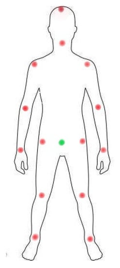 Schematic diagram of the location of the selected feature points (red dots are the 14 selected feature points; green dots are the anchor points of the SC).