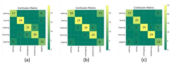 Covariance matrix for classification with KTH-5 using different methods of processing combined with KNN-DTW networks. (a) Raw, (b) SC, (c) SC + SRN.