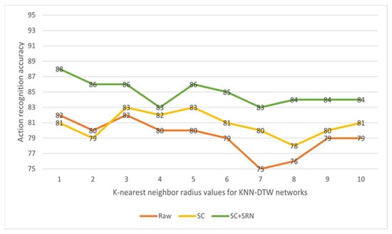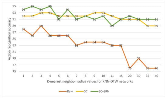 The overall classification accuracy scores for the two networks are shown in Table 4 and the covariance matrix corresponding to the KNN-DTW network test results is shown in Figure 3. For the KNN-DTW network, the action classification accuracy based on the raw data was 82.46%, and it reached 83.33% after adding the SC. After adding the SC + SRN, the classification accuracy was further improved to 87.72%, with a final improvement of 5.26%. For the tsai-MiniRocket network, the classification accuracy was 91.29% with the raw data and it reached 92.28% after adding the SC. After adding the SC + SRN, the classification accuracy was further improved to 93.86%, with a final improvement of 2.57%. To further examine the robustness of the method under different parameters, we also tested the KNN-DTW network with different radius K parameters. The results are shown in Figure 4. Our method significantly improved the network performance with all parameters.