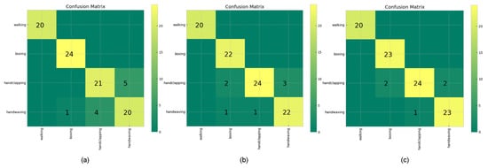 After observing the detailed results for KTH-5 classification using the KNN-DTW network. We found that the classification performance with the first four classes of actions (KTH-4) improved significantly after adding the SC, while the overall classification accuracy improved by only about 1%. This was due to the large decrease in the classification performance for the fifth category of actions. Referring to Figure 3a,b and Table 1 and Table 2, this was because the network incorrectly predicted the fifth class of action (jogging) as the first class of action (walking). Combining the principles of KNN-DTW networks, we analyzed the reasons for this result. The use of SC reduced the magnitude of the change in the distance between each feature point and the origin, making the DTW distance between the two types of actions smaller with our feature fusion method. This reduced the final DTW distance variability between the two types of action sequences, resulting in the KNN-DTW network not being able to distinguish them significantly. This was caused by the misfit between the feature fusion method and the KNN-DTW network. Therefore, to verify the validity of the method and to reduce the effect of this misalignment, we removed the fifth category of actions. The remaining four categories of action samples (walking, punching, waving, and clapping) in the KTH dataset were tested for classification, and the results are as follows.