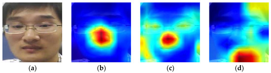 Face image feature map of the fourth ResNet50 convolution layer output. (a) Original image; (b–d) face feature map.