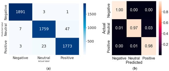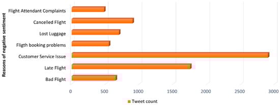Various strategies have been put out to address the issue of class imbalance. The oversampling method is the most well-liked of them all. The essential idea behind the strategy is to introduce various ratios of synthetic samples while oversampling the minority class [33]. For binary and multi-class classification tasks, imbalanced classes present a significant challenge in the training of an effective classifier [34,35]. Due to the extreme imbalance between the classes, a majority classifier would produce very accurate results by assigning the most prevalent class to each instance but failing on majority items from the other present classes will lead to a decreased performance in terms of low accuracy and F1-score, which are our main performance criteria. In order to get around this issue, class resampling approaches give us several distinct additional options. In under-sampling techniques, the part of the predominant class is removed from the training data, bringing the size of the training dataset closer to or on par with the minority class. The disadvantage of such a strategy is that the less dominant class is too small to make the other present classes equal to its size, which results in the loss of a significant amount of important and valuable information. A contrasting process is accomplished using the oversampling method. By multiplying the instances of the minority class to the required size, the minority class is made larger to match the size of the predominant class. The benefit of this approach is that it keeps all of the dataset’s important data. Numerous algorithms have been presented that are based on oversampling as discussed in the literature review. The most important aspect of proposing an efficient algorithm is to lose the least amount of data possible. The most effective way to solve this issue is through oversampling. As it is visible from Figure 3, that dataset has a lot more tweets that belong to the negative class. Negative sentiment tweets have over 9000 tweets which is about 63% of the dataset, whereas the neutral class is 21% and positive class is only 16%. Our framework addresses the class inequality by oversampling the less dominant classes randomly. One of the most recently used oversampling method is SMOTE [29], but for our framework we chose a random oversampling approach which involves making copies of instances in the less dominant classes, although these instances will not add any new information to the framework, but new instances will be copied from the existing instances.