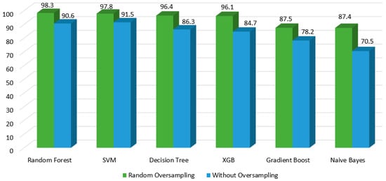 It is clear from the results below that resampling effects the results of each classifier. Using oversampling might be useful but it may cause overfitting, whereas under sampling results in huge loss in accuracy due to underfitting, which is caused by a reduction in the majority class of an already small dataset. Figure 8 presents the direct accuracy comparison between oversampling and no oversampling results. We can see that the results have been dramatically improved when random oversampling is utilized for the data imbalance. For certain classifiers, the improvement is extremely evident. This result was possible because we handled the data imbalance correctly.