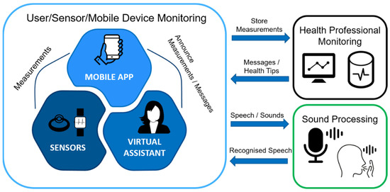 Mobile healthcare is also another field that has been exploring the potential benefits of using intelligent VAs to provide e-health services to individuals. Motivated by the need to find practical solutions for the complex and diverse problems created by the aging population, researchers are looking into creating health interventions that promote self-management of chronic illnesses (i.e., high blood pressure, diabetes, etc.) outside the traditional doctor–patient communication channels. At the same time, advances in the computational power of smartphones and their ability to connect to mobile sensors or monitors, in combination with advances in natural speech recognition and voice communication technologies, seem to make them an ideal platform for applications designed to assist individuals in managing chronic conditions. As a result, the feasibility of employing embodied conversational agents (ECAs) in the context of eHealth and mHealth use case scenarios has gained considerable research attention in the past few years. mHealth addresses mobile health-related scenarios where devices are used to collect, transmit, and process vital patients’ data, such as heart rate and blood pressure, in real time []. Some recent examples of mobile applications for monitoring health issues that employ VAs are presented here.