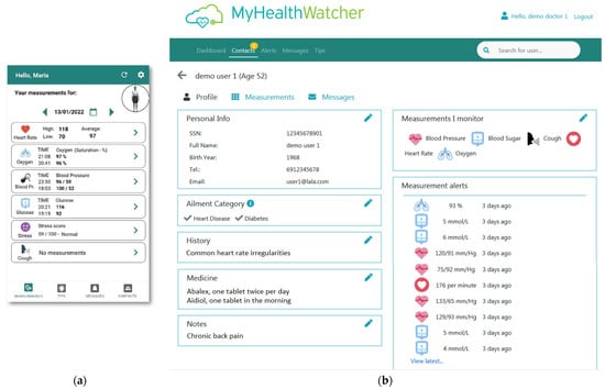 (a) Mobile app. (b) Secondary user side example—patient’s profile view page.