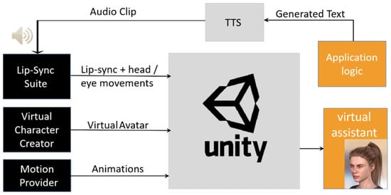 The main technology behind the deployment, maintenance, and functionalities of the VA agent is Unity 3D []. Unity 3D (or just Unity) is a cross-platform game engine that includes, among others, an integrated development environment (editor), a rich toolset, and an asset marketplace. Its main scripting language is C#, and it can be used to activate animations, play sound files, and perform other scripting tasks. An important feature of the engine is that there is plugin support, which can significantly extend the capabilities of the editor and provide a plethora of new tools for building 3D applications.