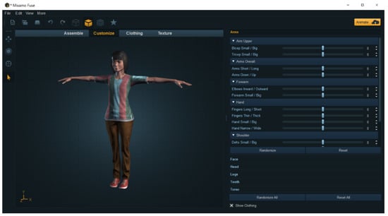 For the first implementation of the virtual assistant, we used Adobe Fuse CC, a simple 3D character creator developed by Mixamo [] and provided by its parent company Adobe Inc. This software lets users select and adjust character components such as parts of the human body through an intuitive interface. After selecting body part types, the user can select a hairstyle and clothes to dress the character. Finally, after the basic structure of the model is defined, the software offers several sliders corresponding to body features that can be adjusted to change the model’s appearance. These can be seen in Figure 4. Unfortunately, Adobe has discontinued the use of this tool and it is currently not available for further use.