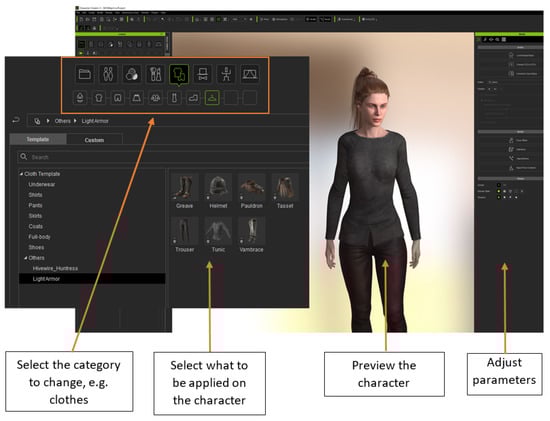 To enhance the quality of the 3D model of our virtual character, we used Reallusion’s Character Creator 3 (CC3) [], which can create high-quality VHs easily and intuitively, and it cooperates with the Unity 3D game engine and the lip-synchronization library. Using CC3, game developers can combine avatar body, face, hair, and clothes by selecting them from a wide variety offered within the software, or they can be downloaded from Reallusion’s market. In Figure 6, a screenshot from the CC3 is shown, where we have zoomed in on the controls for character configuration. Game developers can choose a category from the library, and the respective items available will appear. Then, developers can choose an item to be applied to their character—that can be the face, body, hair, clothes, makeup, pose, and others. Once the developer is satisfied with the created avatar, they can export it in various formats, including the Unity supported .obj and .fbx. An extra option for selecting the target platform is provided in the export window, along with some other export options. In our case, we selected Unity 3D as the target platform and the .fbx format.