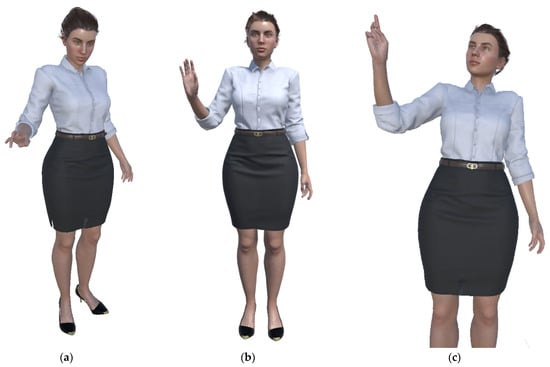The literature offers examples where VHs have assisted with education, individually aiding users with computer access in various cases, such as teaching army officers interpersonal and leadership skills [], having VHs educate users in virtual environments, museums, or other 3D worlds [,,,,,], or even offer anti-bullying support through story-telling applications []. Another interesting use case for VHs is that of multi-modal communication to better imitate human–human interaction as well as employing realistic motions and nonverbal communication correctly to enhance immersion and credibility []. Furthermore, VHs have been employed for demonstration purposes in training applications and process presentations [,].