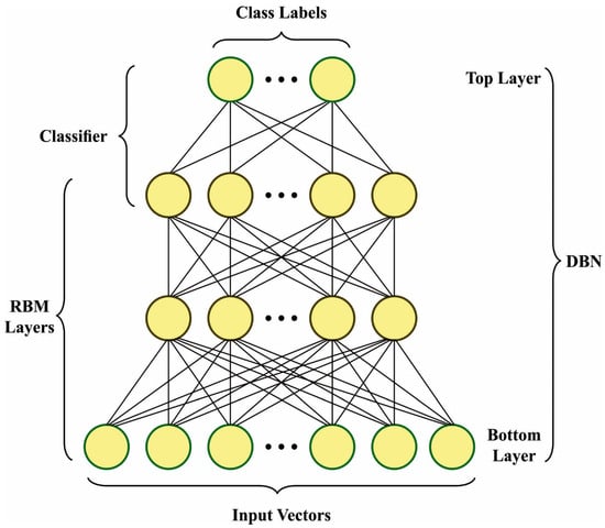 In this work, three algorithms (Equations (4)–(6)) first included in conventional DBN network, the second term couldn’t be directly attained. Since it was the probability in distribution that could be studied using the DBN. Gibb’s sampling is used for calculating these probabilities. However, this technique can be time-consuming and could be used in real-time. For finding a better solution, the contrastive divergence (CD) technique is used, fast-learning algorithm. Firstly, a training instance was utilized to finish the start of the Markov chain. Then, samples can be attained afterward the steps of Gibb’s sampling. This technique is named CD-k. Note that the performance of CD can be satisfactory if . Figure 2 depicts the infrastructure of DBN.