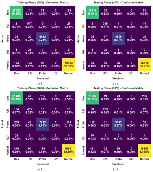 Confusion matrices of FSHDBN-CID approach (a) 60% of TR dataset, (b) 40% of TS dataset (c) 70% of TR dataset, and (d) 30% of TS dataset.