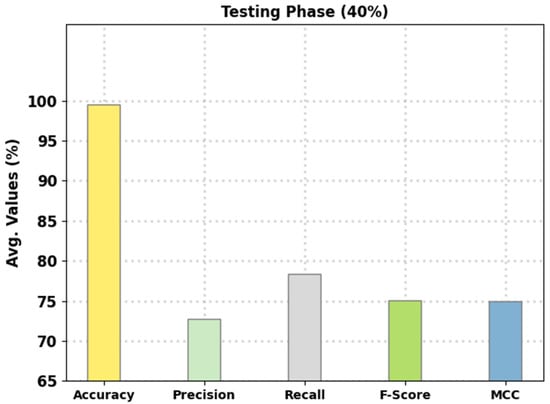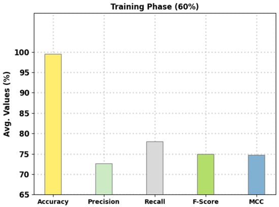 Table 2 provides an overall intrusion detection outcome of the FSHDBN-CID model on 60% of TR data and 40% of TS data. Figure 4 reports the intrusion classification performance of the presented FSHDBN-CID method on 60% of TR data. The experimental outcomes inferred that the FSHDBN-CID model has shown enhanced results under both aspects. For instance, on DoS class, the FSHDBN-CID model has offered of 99.35%, of 99.34%, of 98.88%, of 99.11%, and MCC of 98.60%. Simultaneously, on Probe class, the FSHDBN-CID technique has presented of 99.64%, of 97.46%, of 98.76%, of 98.10%, and MCC of 97.91%. Concurrently, on Normal class, the FSHDBN-CID technique has rendered of 99.28%, of 99.53%, of 99.12%, of 99.32%, and MCC of 98.56%.