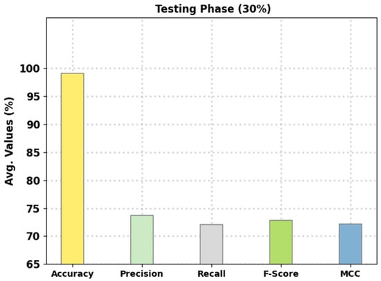 Figure 7 reports the intrusion classification performance of the presented FSHDBN-CID algorithm on 30% of TS data. The experimental outcomes denoted the FSHDBN-CID approach has exhibited enhanced results under both aspects. For example, on DoS class, the FSHDBN-CID technique has displayed of 98.30%, of 97.52%, of 97.84%, of 97.68%, and MCC of 96.35%. At the same time, on Probe class, the FSHDBN-CID algorithm has granted of 99.16%, of 95.91%, of 95.07%, of 95.49%, and MCC of 95.03%. Parallelly, on Normal class, the FSHDBN-CID approach has shown of 98.59%, of 98.59%, of 98.76%, of 98.68%, and MCC of 97.16%.