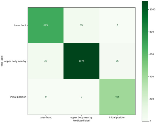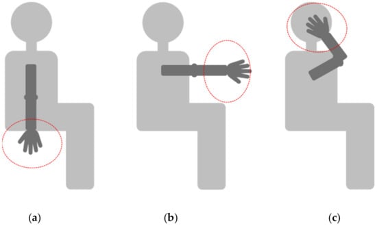 During continuous movement of the upper limb, the end position changes constantly, and we only need to focus on the position where the manipulator may open or close. Usually, we need to control the opening and closing of the manipulator when we reach in front of the torso to grasp or put down objects and when we put on or unload objects near the body. Therefore, this paper divides the upper limb end positions into three categories: torso front, upper body nearby, and the initial position, shown in Figure 3. Among them, torso front refers to the direction of the face, a space far from the torso; upper body nearby refers to the shoulders and the area of the body above the shoulders; the initial position is the area where the arm is naturally drooping and the end of where the hand can reach.