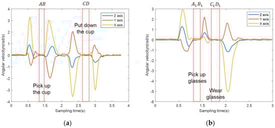 Angular velocity curve of the movement of a healthy person. (a) Angular velocity curve of drinking. (b) Angular velocity curve of wearing glasses.