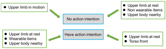 The action of human upper limbs to perform operations on common objects can be broken down into the two stages of grasping and subsequent processes. The type of target usually determines the intention of the upper limb action [28]. In this paper, the target objects are divided into two categories according to their uses: wearable objects and non-wearable objects. Wearable objects are objects that can be worn on the human body or removed from the human body. When the target object is a wearable object and the hand is positioned close to the body, the robot needs to open or close the hand to put on or take off the object. When the target object is a non-wearable object and the hand is positioned close to the human body, the current process is only a transition process for the whole upper limb action, and the manipulator does not need to operate. While the position of the hand is located in front of the torso and the upper limb is stationary, it is generally necessary to grasp or put down the object, at which time the manipulator should be executing an open or close operation. According to the above description, this paper uses the upper limb motion state, target object type, and upper limb end position to jointly decide the intention of the upper limb action; the specific logic is shown in Figure 6.