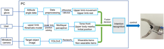The Figure 7 shows a complete description of the prosthetic hand control system based on upper limb action intention recognition. Data gloves are worn on human upper limbs to collect the attitude angle data during the movement of the upper limbs. The pre-processed attitude angle data is differentiated to obtain the angular velocity value to judge the state of the upper limbs and serve as the input of the kinematics model of human upper limbs to calculate the position of the upper limbs. The upper limb end position is classified into three categories by the multilayer perceptron model. The miniature camera is used to capture the target object image, which is classified into two categories after the specific type is detected by the YOLOv5 model. Then, the action intention of the upper limb is determined by the combination of the upper limb motion state, the target object type, and the upper limb end position to achieve manipulator control.