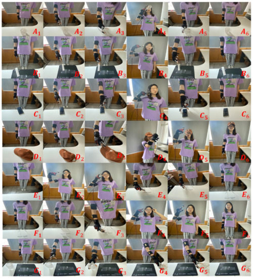 Seven kinds of action flow. A1–A6 represents the action of drinking water; B1–B6 represents the action of combing hair; C1–C6 represents the action of answering the phone; D1–D6 represents the action of putting on a hat; E1–E6 represents the action of wearing glasses; F1–F6 represents the action of taking off glasses; G1–G6 represents the action of moving a cup.