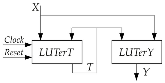 A LUT is a block having inputs and a single output [20,24]. A LUT may implement an arbitrary Boolean function including no more than arguments. The value of is rather small [22]. If the number of arguments of a Boolean function exceeds , then it is necessary to combine together some LUTs. It is quite possible that a function is represented by a multi-CLB circuit. In this case, it is necessary to diminish the number of LUTs and their levels in the corresponding circuit [25,26]. In this article we use the symbol LUTer to show that a corresponding logic blocks includes LUTs, flip-flops and interconnections.