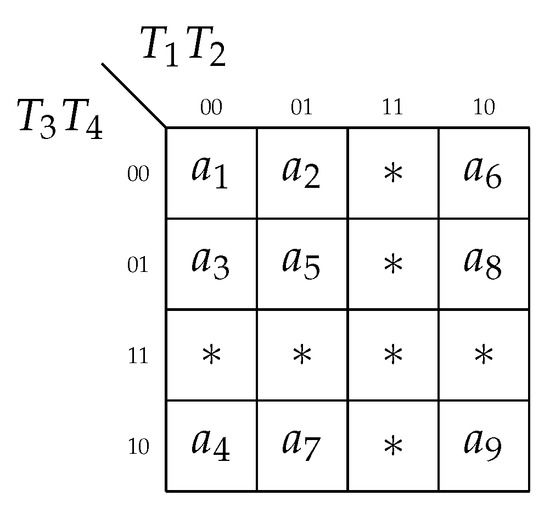 The following partial codes can be found from the Karnaugh map (Figure 7): , , and . These codes are used in LUTs of .