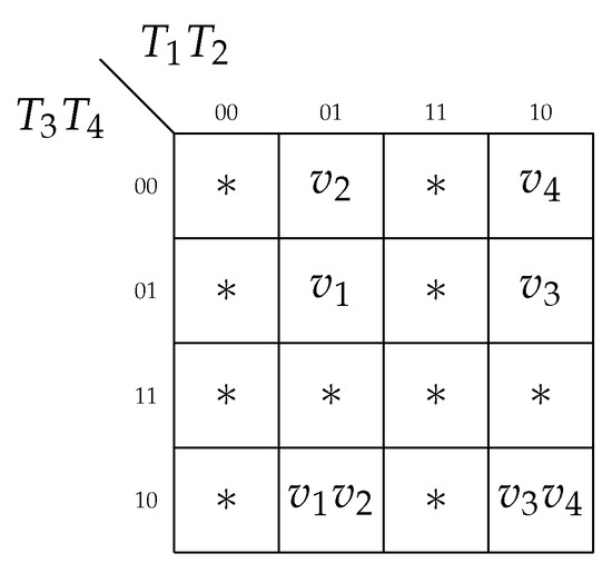 As follows from Figure 6, the states are placed into the cube 00xx. This allows optimizing SOPs of functions (15)–(17). The states are placed in the cube x100, the states are placed in the cube 1x00. This gives the opportunity to optimize SOPs of functions (12).