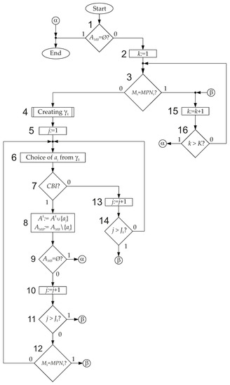 Step 2. To divide the set A by sets and , it is necessary to find values of for states . The following values can be found from Table 1: ; for states , , , ; for states , , , . There is . As follows from (14), there are the sets and . As we show in the next section, some elements of the set can be transferred to the set . Thus, these sets do not yet have a final form. Now, we can find sets and . The set includes inputs determining transitions from states , the set includes inputs determining transitions from states . In the discussed case, there are the following sets: and .
