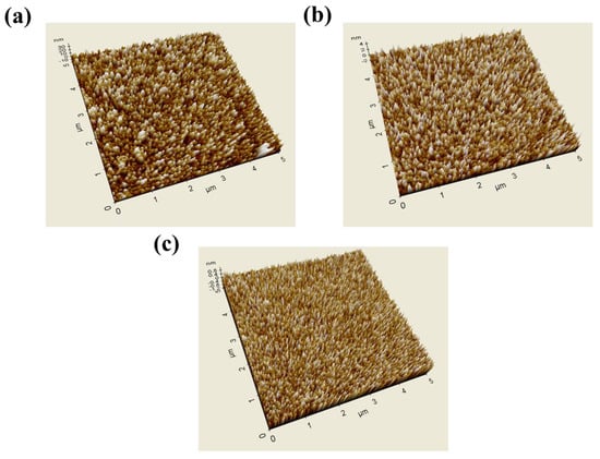 Figure 2a–c show the surface roughness of the a-IGZO thin film after heat treatment obtained via AFM analysis. Figure 2a,b were subjected to a typical heat treatment at 200 °C and 300 °C for 1 h, and in the case of Figure 2c, microwave heat treatment was performed at 200 °C for 10 min. As a result of AFM surface analysis, the thin film in Figure 2a shows a value of 5.346 nm, that in Figure 2b shows a value of 0.653, and that in Figure 2c shows a value of 0.211 nm. As can be seen from the AFM analysis results, the RMS value of a thin film that was subjected to microwave heat treatment at 200 °C for 10 min was lower than that of the typical thin film heat treated at 200 °C and 300 °C for 1 h. These surface roughness characteristics affect the electrical characteristics evaluation, and, as shown in Table 1, the results are similar to those of the device subjected to typical heat treatment at 300 °C for 1 h. Microwave heat treatment is very efficient, with only low temperatures and heat treatment being carried out for a short period of time. In addition, microwave heat treatment does not cause thermal damage even at high power, but with typical heat treatment, it does cause serious damage at high temperatures [30].