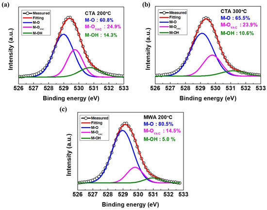Figure 3 shows the O1s spectra of IGZO films annealed at conventional thermal annealing (CTA, OTF-1200X, MTI Corporation, Richmond, CA, USA) at 200 °C and 300 °C, and microwave annealing (MWA, UMF-01, Unicera, Pyeongtaek, Korea) at 200 °C. We decomposed the obtained O1s XPS spectra into three individual components with different binding energies of 529, 530, and 531 eV. The peaks at 529, 530, and 531 eV are associated with stoichiometric oxygen (contained in M-O); oxygen vacancies (Vo); and loosely bound oxygen impurities (M-OH), such as chemisorbed oxygen, H2O, and CO3, respectively. In general, it is well-known that the M-OH peak is associated with the electron trapping site. As shown in Figure 3, MWA-treated IGZO has a smaller M-OH than CTA-treated IGZO. This means that MWA can reduce defects in IGZO thin films more effectively than CTA.
