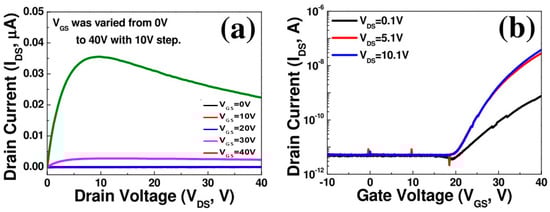 Figure 5a,b present the output and transfer characteristics, respectively, of the a-IGZO TFT thermally annealed at 300 °C. In this case, better electrical performance parameters than those of the device annealed at 200 °C can be noted. These parameters include the threshold voltage, saturation mobility, and current on/off ratio. The threshold voltage, current on/off ratio, subthreshold swing, and saturation mobility were evaluated to be 7.5 V, 7.76 × 105, 2.74 V/dec, and 6.06 cm2/Vs, respectively.