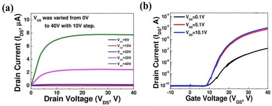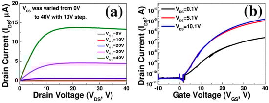 Figure 4a,b illustrate the output and transfer characteristics, respectively, of the a-IGZO TFT thermally annealed at 200 °C. In this case, the poor electrical performance of the device can be primarily attributed to the atomic rearrangement of the active layer. In previous studies, the saturation mobility of an a-IGZO TFT was found to be higher than 10 cm2/Vs. Prior to the heat treatment process, a-IGZO thin films have lattice gaps or defects between the lattice and decrease in reliability due to large amounts of oxygen vacancy. In addition, the surface is very rough, and cracks can also be present. However, the heat treatment process causes particle collisions, and the resulting consequences of shock heating can close the gaps between the lattice and cause a decrease in particle size [36,37].