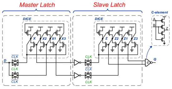 - Jaya, G.L.; Chen, S.; Liter, S. A dual redundancy radiation-hardened Flip-Flop based on C-element in 65nm process. In Proceedings of the 2016 International Symposium on Integrated Circuits (ISIC), Singapore, 12–14 December 2016; pp. 1–4. [Google Scholar]