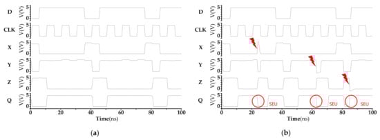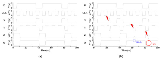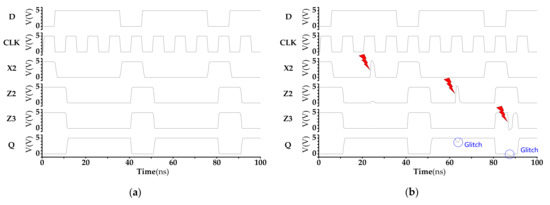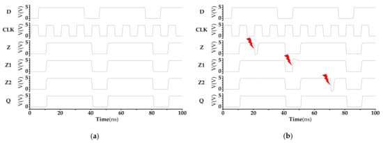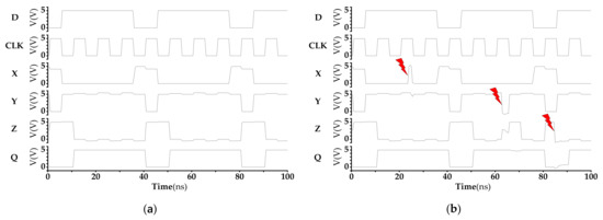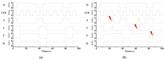 CCDM-TSPC: (a) simulation waveform of CCDM-TSPC without SETs; (b) simulation waveform of CCDM-TSPC with SETs.