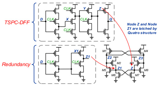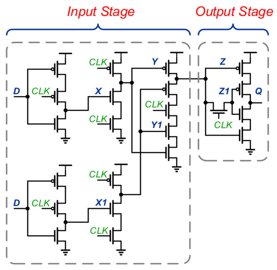 TSPC-DFF can also be radiation-hardened with redundant methods. The circuit diagram of the dual modular TSPC D flip-flop (DM-TSPC) is shown in Figure 10 [34]. The input stage of DM-TSPC consists of two identical TSPC-DFFs, while the output stage contains a C-element. In this way, SETs generated at node X, node Y, and node Z within the TSPC structure will not cause SEUs in the output stage.