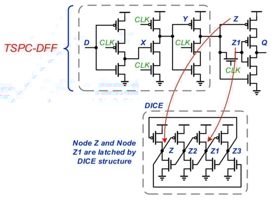 - Jahinuzzaman, S.M.; Islam, R. TSPC-DICE: A single phase clock high performance SEU hardened flip-flop. In Proceedings of the 2010 53rd IEEE International Midwest Symposium on Circuits and Systems, Seattle, WA, USA, 1–4 August 2010; pp. 73–76. [Google Scholar]
