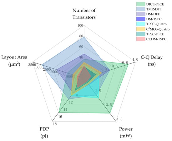 In this section, the performance of CCDM-TSPC and the other seven comparison structures is evaluated in six aspects. There are design complexity, C-Q delay, power consumption, power delay product (PDP), layout area, and SEU robustness. Design complexity is the number of transistors used to design a circuit. The C-Q delay represents the delay from the rising edge of the clock to the steady state of the trigger output. Power consumption is the product of the average voltage and the average current of the power supply. PDP is the product of the time taken to complete a computational task and the average power consumption [38]. Here, it refers to the energy required for the trigger to complete a state flip. The layout area is the total area of all transistors and layout wiring. All data were simulated using the SPECTRE tool. Table 1 shows the data for five indicators for the eight structures. The performance of the eight structures is shown on a radar chart in Figure 20. It can be seen intuitively that CCDM-TSPC has better performance on the basis of satisfying complete immunity to SEUs. In addition, the impact of process variation on the proposed CCDM-TSPC is evaluated by Monte Carlo simulations in Section 4.7.