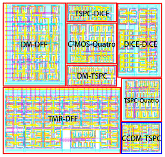The layout design of all the mentioned structures is shown in Figure 21. The area of the layout depends heavily on the number of transistors. The TMR-DFF with 78 transistors has the largest layout area of 2880 μm2. TSPC-DICE has the smallest layout area of 319 μm2 because it does not contain any redundant structure. The layout area of DICE-DICE and DM-DFF is over 1000 μm2. The layout area of the proposed CCDM-TSPC is 456 μm2. Compared with TMR-DFF, DM-DFF, and DICE-DICE, the layout area of CCDM-TSPC is reduced by 85%, 75%, and 60%, respectively.