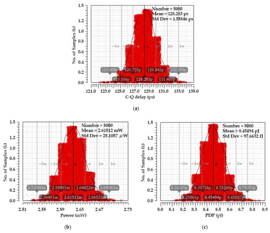 Monte Carlo simulation results of process variation: (a) C-Q delay, (b) power, and (c) PDP.