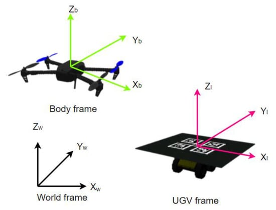 This paper proposes a complete scheme for UAVs landing on a moving UGV with unknown obstacles in the environment. The quadrotor, UGV, and main coordinate frames used in the scheme are shown in Figure 1. The UAV is at a distance from the target UGV at the initial moment. At this stage, the UAV needs to avoid obstacles while approaching the UGV. After the drone moves closer to the UGV, the onboard vision system begins to work to guide the drone to land precisely.