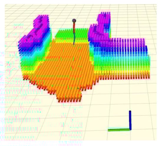 The local trajectory is visualized in Rviz, as shown in Figure 6. The height of the obstacles in the figure can be seen intuitively through colors: red represents the lowest, while purple represents the highest. It can be seen in Figure 6 that the algorithm used here can model the obstacles accurately to plan a collision-free trajectory between the UAV and the moving UGV.